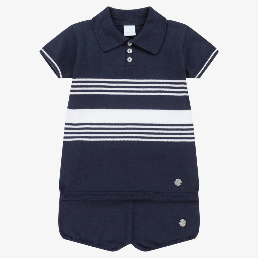 A navy blue shorts set for little boys by Spanish brand Artesania Granlei, knitted in the softest cotton blend. Classical and casual, the striped polo shirt has mother-of-pearl button fastenings with a charm logo on the front. The coordinating shorts have an elasticated waistband for a comfortable, pull-on style.