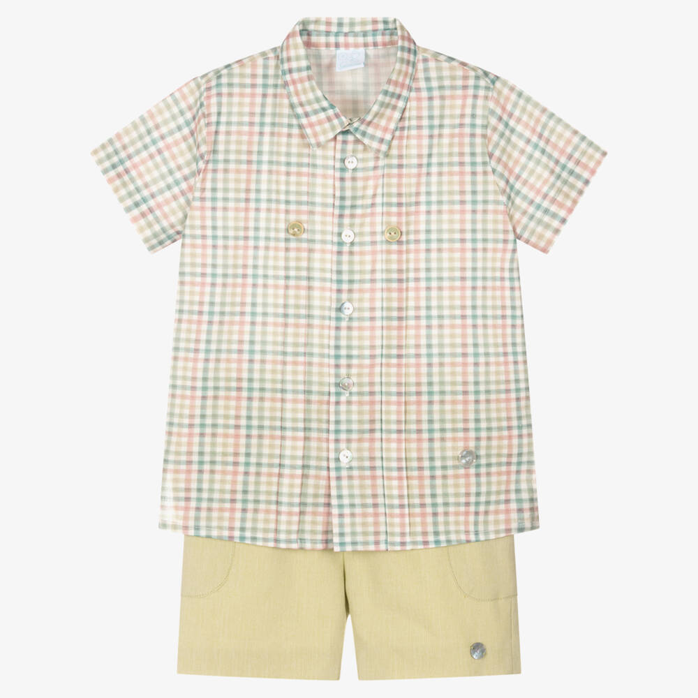 A classically styled shirt and shorts set for boys by Spanish brand Artesania Granlei, made in lightweight cotton. The green and pink checked shirt is pleated on the front, with decorative green wooden buttons, and mother-of-pearl button fastenings. Woven in soft cotton, the shorts are fully lined for comfort and are gently elasticated around the waist. They have useful patch pockets on the sides and are finished with the brand's mother-of-pearl logo tile for a designer touch.