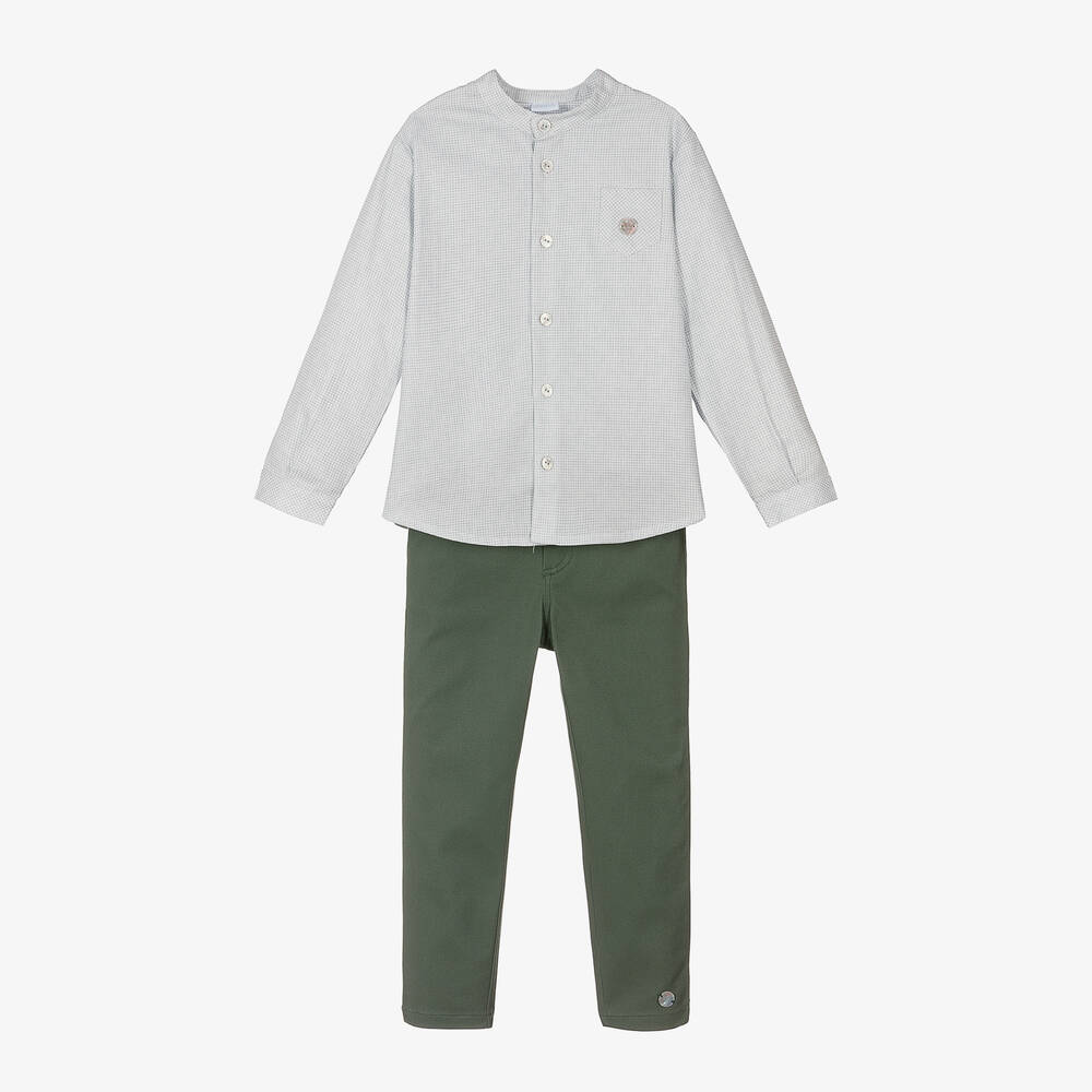 A blue and green trouser set for boys by Spanish brand Artesanía Granlei, ideal for smart-casual occasions. The cotton shirt is collarless and patterned with a timeless gingham check. It fastens with pearlescent buttons on the front and on each cuff. The small chest pocket is stitched with a mother-of-pearl logo charm for subtle branding. The paired trousers are soft to the touch and adjustable on the waist. They have useful pockets and a button and zip fastening on the front.