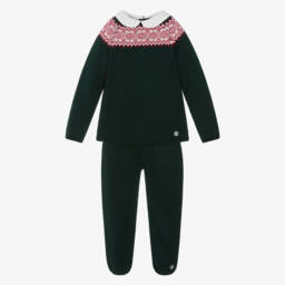An exclusive to Childrensalon, this forest green knitted trouser set for boys by Artesanía Granlei has a charming red and white Fair Isle motif. Comfortable and cosy, the set includes a long-sleeved top with a smart white collar and matching trousers with a useful adjustable waistband. Both pieces are finished with a signature mother-of-pearl charm.
