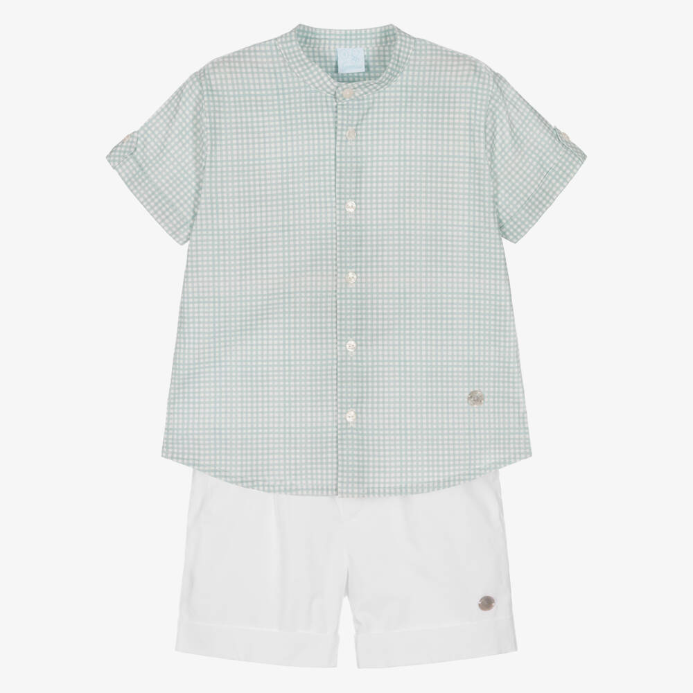 Ideal for smart-casual wear, this classic shirt and shorts set for boys is by Spanish brand Artesania Granlei. Made from soft cotton in a collarless style, the green and white gingham shirt has turned-up short sleeves, trimmed with button tabs. Fully lined for comfort, the white cotton shorts have an adjustable waist, faux pockets, and a button and zip fastening on the front.