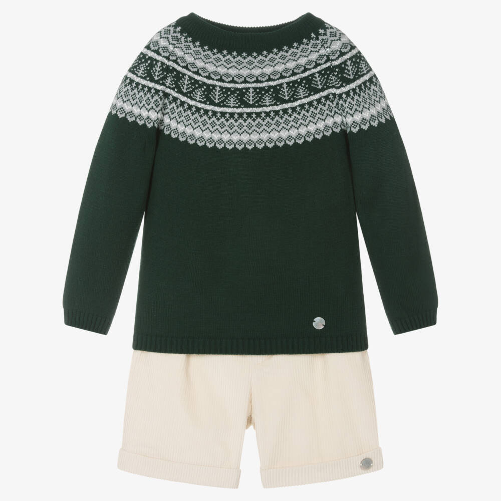 Exclusive to Childrensalon, this green and ivory shorts set for boys is from Artesanía Granlei. The knitted crew neck sweater has a grey Fair Isle pattern and neatly ribbed trims for a classic style. A pair of cotton corduroy shorts complete the outfit, with pockets and turn-up hems. They fasten with a button and a zip and have an adjustable waistband for a good fit. The brand's signature mother-of-pearl charm finishes both pieces.