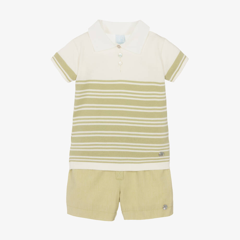 A classically styled ivory and green shorts set for boys, by Spanish brand Artesania Granlei. Knitted in a super soft cotton blend, the striped polo shirt has a smart pointed collar and mother of pearl button fastenings on the front. Lightweight for summer, the shorts have a decorative tie and buttons, with an adjustable waistband and a breathable voile lining.