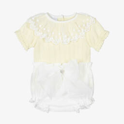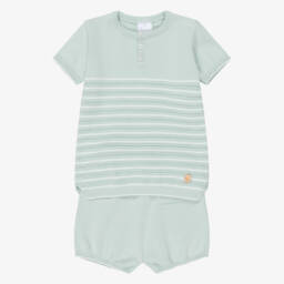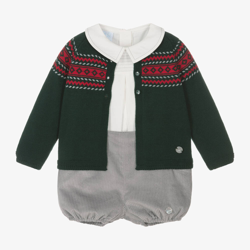 Traditional three piece shorts set for little boys by Spanish brand Artesania Granlei, exclusive to Childrensalon. The ivory, cotton-blend shirt has smart grey stitching on the collar and bodice, a central, inverted pleat and gently elasticated cuffs. It fastens on the back with buttons. The green knitted cardigan has a Fair Isle design around the shoulders in red and white, and neat, ribbed trims. It fastens on the front with buttons. The soft, grey corduroy shorts have a full shape with decorative mother-of-pearl buttons on the front and elasticated cuffs. They have faux pockets and an adjustable waistband for a comfortable fit. They are fully lined for comfort and are easy to wear, simply pulling up. There is an iridescent logo charm on each piece.
