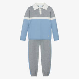 In a navy blue and beige colour palette, this softly knitted trouser set for boys is by Artesanía Granlei. The top has a classic polo-style collar, button fastenings and a mother-of-pearl logo charm to finish. The coordinating trousers have stretchy ribbed cuffs and an elasticated waist that is adjustable for an ideal fit.
