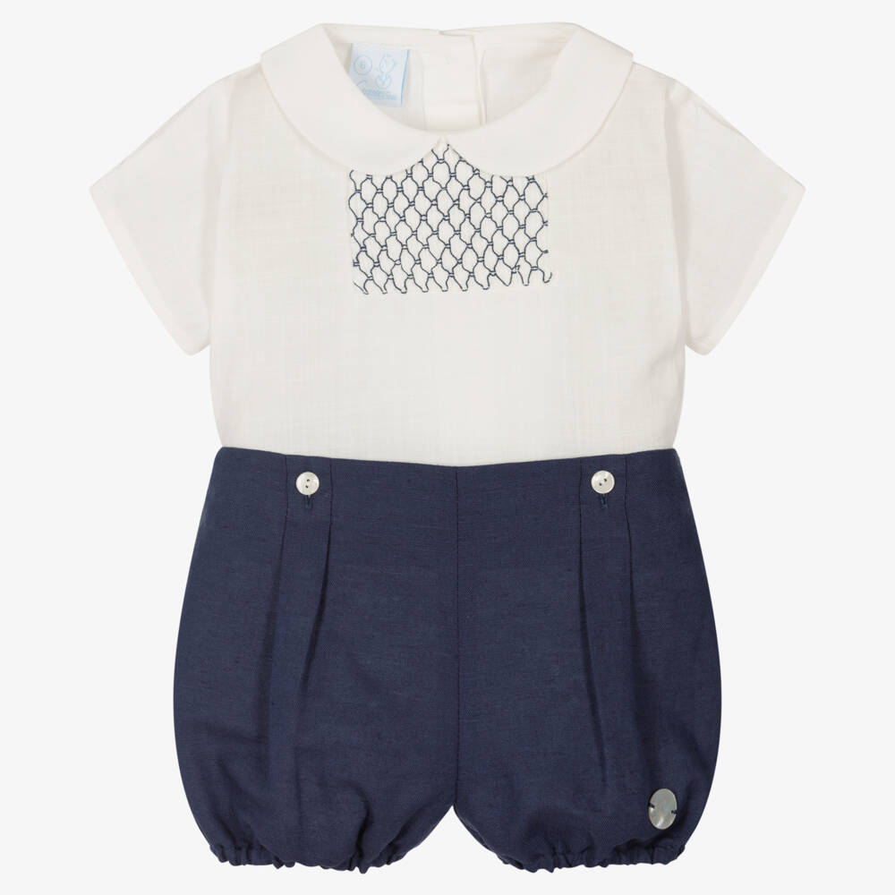 This ivory and navy blue buster suit, for little boys, is by Spanish brand Artesania Granlei. Traditionally charming, the shirt has a Peter Pan collar, and a smocked chest with cross stitch detailing. It is made in the softest lightweight cotton voile, and has useful button fastenings on the back. The top pairs smartly with the linen blend shorts, which have gently elasticated trims and a mother-of-pearl charm logo on the front. For a tidy tucked in style, both items fasten together with pearlescent buttons.