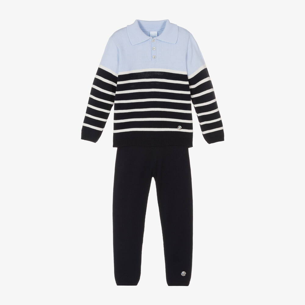 A knitted trouser set for boys by Spanish brand Artesanía Granlei, styled in a navy blue and light blue colourway with white stripes. The long-sleeved sweater has a collared neckline with pearlescent button fastenings. It has ribbed knit trims for comfort and mother-of-pearl branding on the hem. The matching bottoms have a stretchy, ribbed waistband for easier dressing.