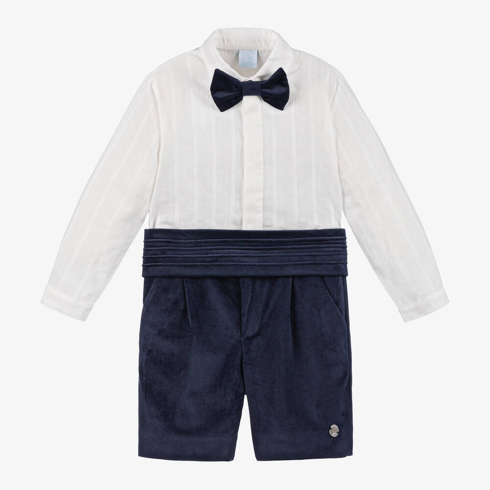 Super smart navy blue velvet shorts set for boys by Spanish brand Artesanía Granlei, ideal for any special occasion. The white, lightweight cotton shirt has stitched stripes and a covered, button-fastening placket. The beautifully soft, velvet shorts have slanted pockets and button and zip fastenings on the front. Fully lined, they have a useful, adjustable waistband for a great fit. Completing the set is an adjustable, velvet bow tie and a cummerbund-style belt, secured with poppers on the back. The shirt and shorts have the brand's mother-of-pearl logo charm for instant brand recognition.