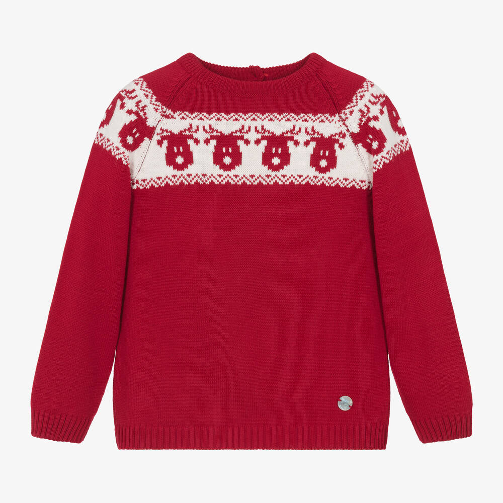 Exclusive to Childrensalon, a festive red sweater for boys by Spanish brand Artesania Granlei. It has a white, Fair Isle style band around the shoulders with cute red reindeer knitted into the weave. Soft and lightweight, with long sleeves and warm, ribbed trims, it is ideal as an extra layer on chilly days. There is an iridescent logo charm sewn by the hemline, and button fastenings can be found on the back.