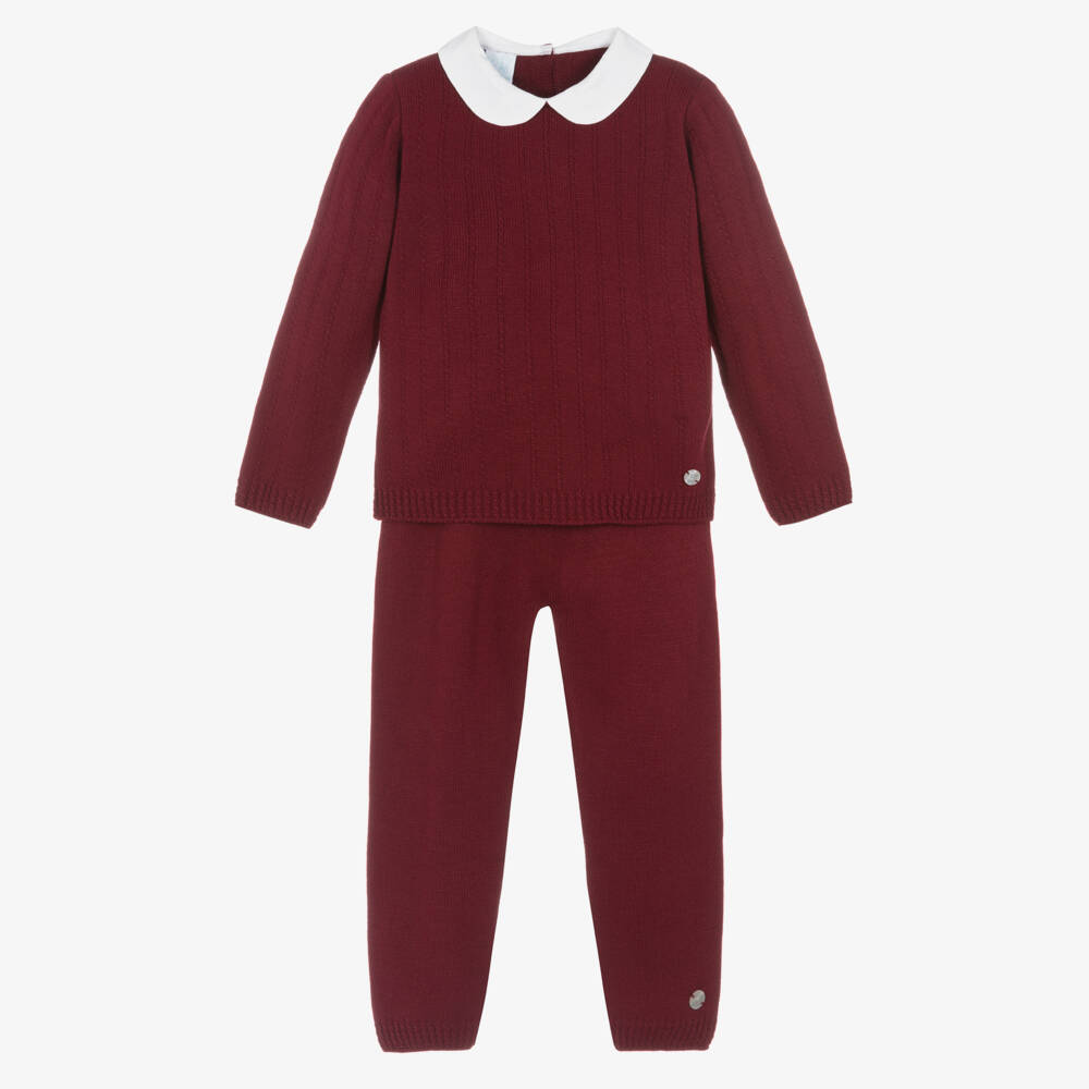 Exclusive to Childrensalon, this burgundy red knitted trouser set for boys is by Spanish brand Artesanía Granlei. The delicately patterned top has an ivory Peter Pan collar for a traditional look, with back button fastenings. The trousers have an elasticated adjustable waist for a comfortable fit. Both pieces are trimmed with a faux mother-of-pearl logo charm.