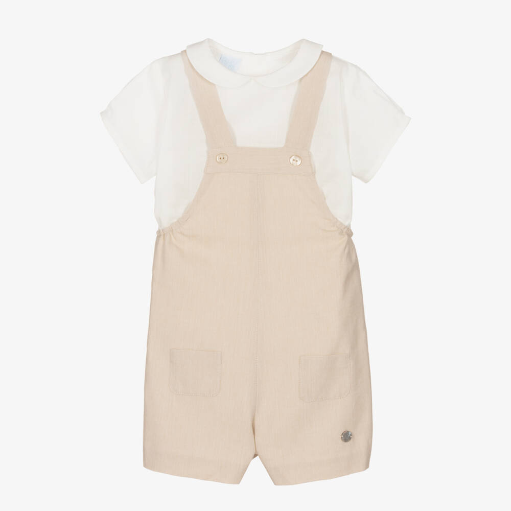 Cute smart-casual shorts set for little boys by Spanish brand Artesania Granlei. The white shirt is made in lightweight cotton with a Peter Pan collar and button fastenings on the back. Fully lined for added comfort, the beige shorts have braces that fasten with buttons and lightly elasticated trims for easy dressing.