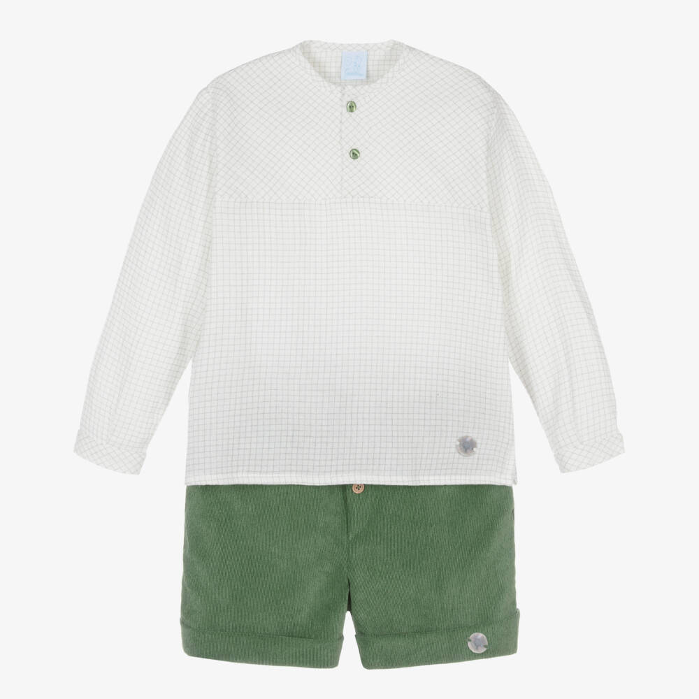 A white and green shorts set for boys by Spanish brand Artesanía Granlei. The collarless cotton shirt has a subtle green grid pattern and iridescent buttons to match the soft corduroy shorts. With faux pockets, a fixed drawstring and decorative buttons on the front, the fully lined shorts have an adjustable waist to ensure comfort and room for growth. Both pieces are finished with mother-of-pearl logo charms.