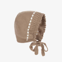 Lovely brown bonnet for baby boys and girls by Artesanía Granlei, ideal for keeping little heads warm while adding a charming touch to any outfit. Softly knitted, it has a circular pattern on the back and delicate scalloped trim with contrasting ivory detailing. The ties secure neatly under the chin for a snug fit.