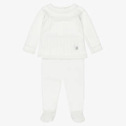 Exclusive to Childrensalon, this charming beige babysuit set for girls by Artesanía Granlei, is finely knitted for warmth and comfort. The top has a delicate lace collar, scalloped trim and back button fastenings, while the trousers have cosy enclosed toes, trimmed with bows. A matching bonnet completes the sweet, traditional look.