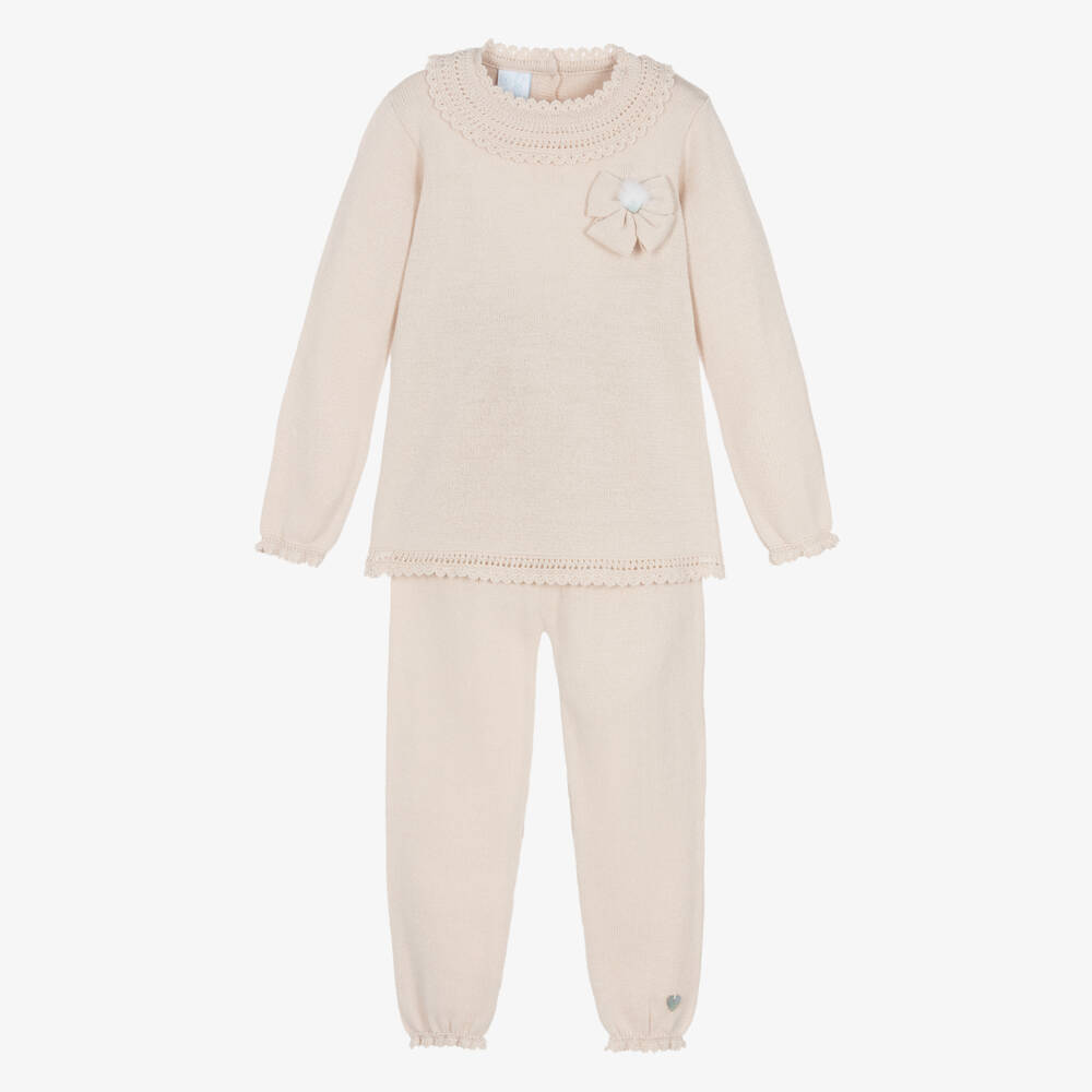 Sweet beige trousers set for girls by Artesania Granlei, made in a super soft knit, with glittery gold threads. The top has a pretty lacy knit collar, open-work detailing on the hem and scalloped edges on the hem and cuffs. It fastens with buttons on the back and has a 3D knitted bow on the front with a faux fur trim and the brand's signature logo charm. The bottoms have matching scalloped edges on the cuffs, a comfortable elasticated waist and matching logo charm.