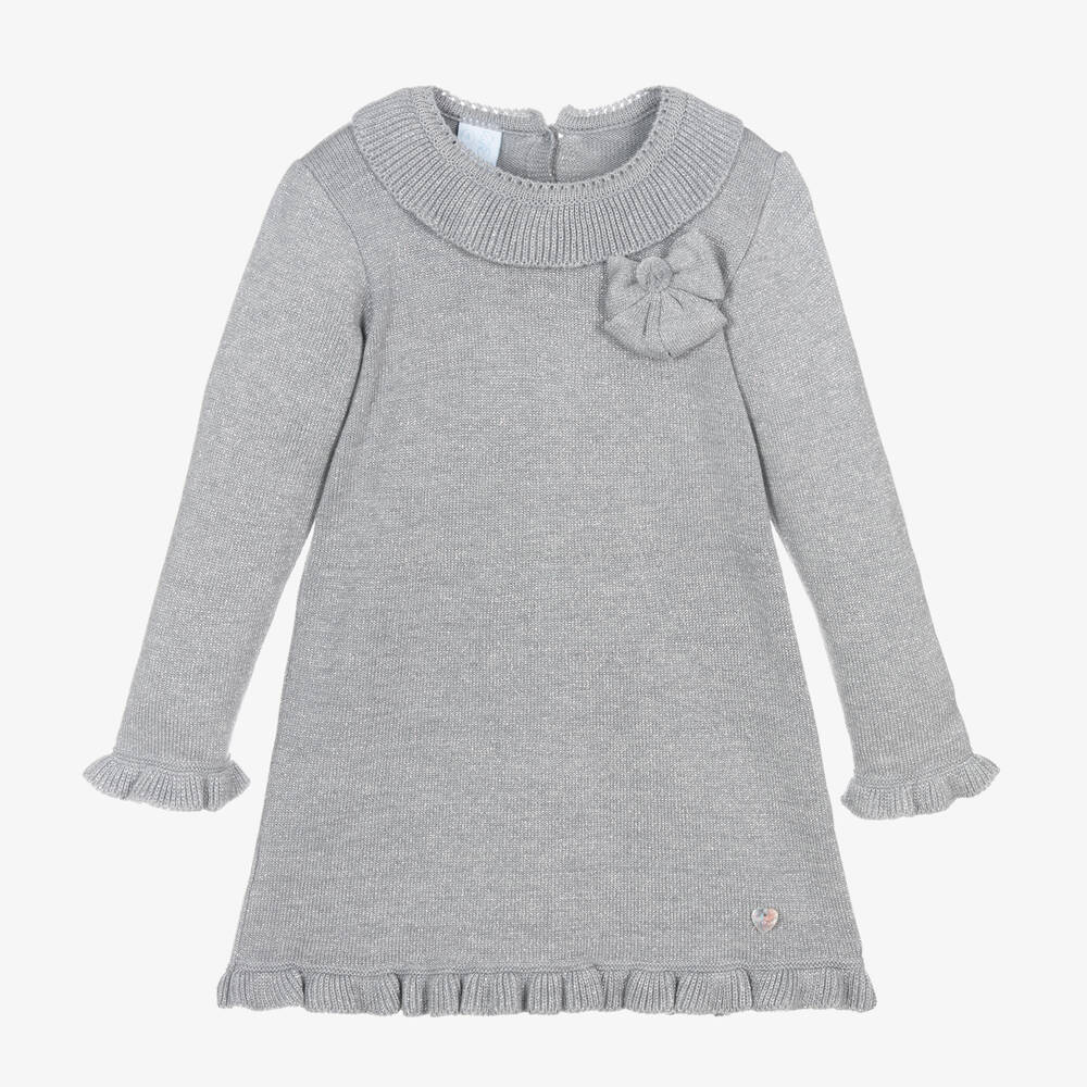 Exclusive to Childrensalon, a glittering silver dress for girls by Spanish brand Artesanía Granlei, just right for a special occasion or party. Made in a lightweight knit, it has frilly trims and a fixed bow on one side with a central pom-pom. It fastens with buttons around the back. A heart-shaped, iridescent logo charm is sewn by the hemline for a finishing designer touch.