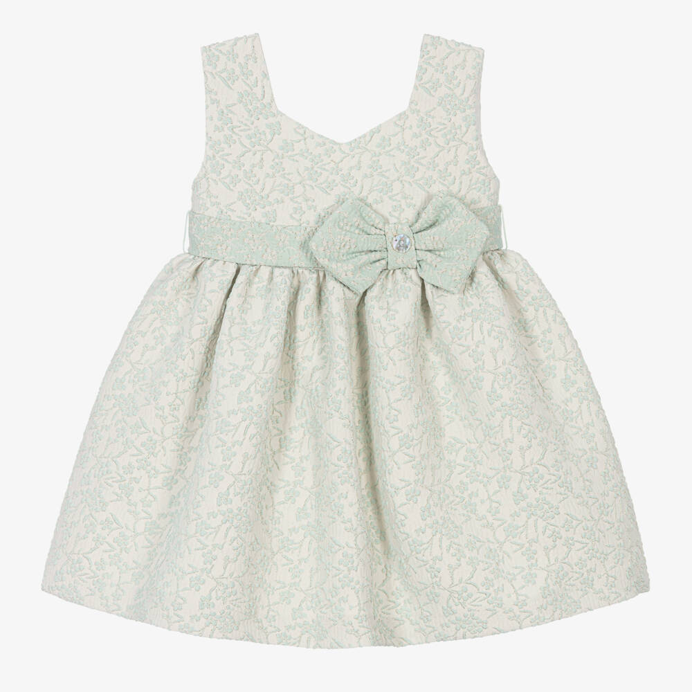 Pale green and ivory with a touch of golden sparkle, this gorgeous special occasion dress for girls is by Spanish brand Artesania Granlei. In a beautiful floral jacquard pattern, it has a fixed belt around the waist, trimmed with a stunning bow on the front. Fully lined for comfort in a cotton blend, the dress fastens with a concealed zip on the back and has traditional mother-of-pearl button fastenings on the belt.