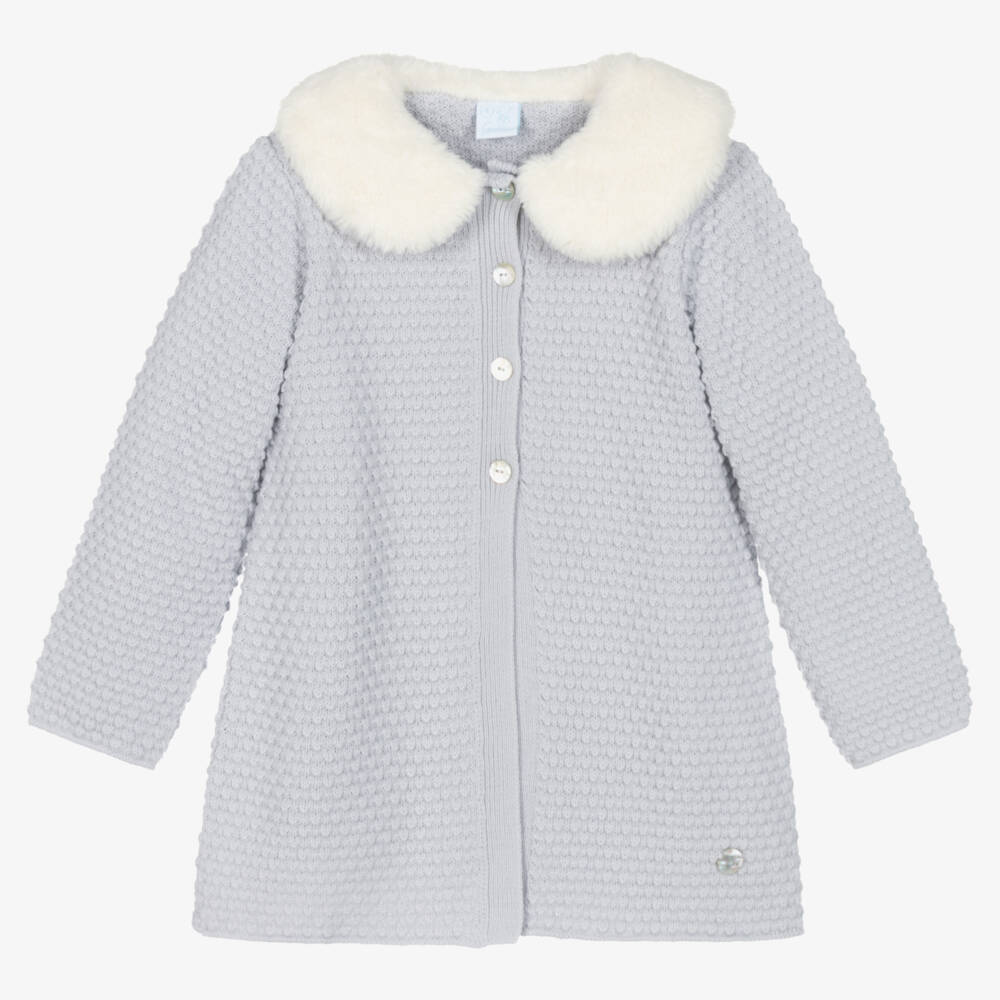Grey coat for girls by Spanish brand Artesania Granlei, knitted in a pretty box stitch. It has a lovely ivory faux fur collar for added warmth and fastens with pearlised buttons on the front. The brand's signature mother-of-pearl logo charm is on the front for a subtle branded finish.