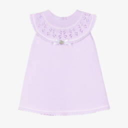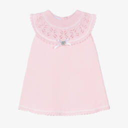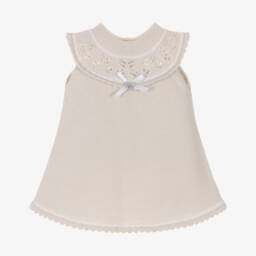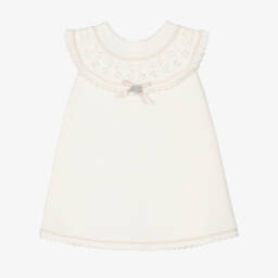A lovely ivory dress for little girls by Artesanía Granlei, finely knitted in a soft cotton blend. This sleeveless style features a charming collar with lacy-knit detailing and delicate embroidery. It has a sweet ribbon bow on the front, with a mother-of-pearl branded charm in the centre. The collar and hem have pretty scalloped edges, and the dress fastens neatly with buttons on the back.