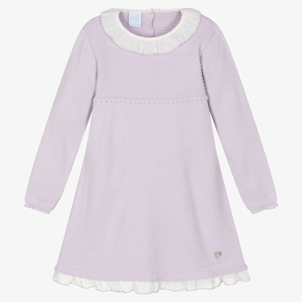 Charming lilac purple knitted dress for little girls by Artesanía Granlei, with a feminine white plumeti frill collar and matching trim at the hem. It has a shimmering logo charm sewn near the hem and fastens with simple buttons on the back.