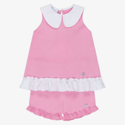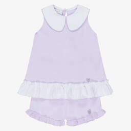 Lovely lilac purple top and shorts set for girls by Artesanía Granlei, knitted in a soft cotton blend. The top has a contrasting white collar and pretty ruffle hem. It features a white flowy insert at the back, trimmed with a bow for a sweet finishing touch. The shorts have frilly hems and an elasticated adjustable waist for a comfortable fit. Both pieces are finished with a branded mother-of-pearl heart charm.