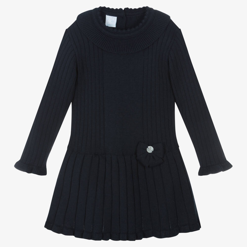 Pretty navy blue dress for girls by Artesania Granlei, made from a cosy knit. The dropped waist skirt is lined for extra volume, and the knitted collar adds to the feminine style. It has a cute knitted bow with a mother of pearl charm on the front, and it fastens with buttons on the back.