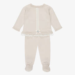 A pale pink knitted two-piece babygrow for girls by Artesanía Granlei. Classically styled, the top has sweet lace trim detailing and fastens with buttons on the back. The footed leggings are comfortable against little tummies with a ribbed waistband and are finished with tonal bows on the feet.
