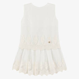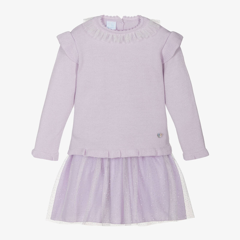 A charming lilac purple skirt set for girls by Artesanía Granlei. Soft and cosy, the long-sleeved jumper is knitted with shimmery threads. It fastens with pearlescent buttons on the back and has a tulle frill around the neckline, and knitted ruffle trims on the shoulders, cuffs, and hemline. The lightweight tulle tutu skirt is decorated with silver glitter for added sparkle and has a smooth cotton-blended lining and an elasticated waist for extra comfort. Both pieces are stitched with a faux mother-of-pearl logo charm on the front.