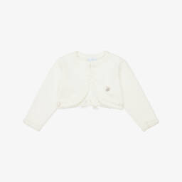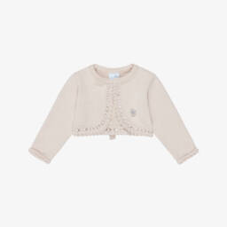 Exclusive to Childrensalon, a gorgeous beige bolero cardigan for little girls by Artesanía Granlei, woven with a touch of shimmering lurex for a sparkly finish. Ideal for layering, it is knitted in a lightweight cotton blend, with interwoven satin ribbon detailing for an elegant touch, and a satin bow around the back. Fastening with a single button, it has scalloped edges, a stylish panel on the back and the brand's signature mother-of-pearl logo charm sewn on one side.