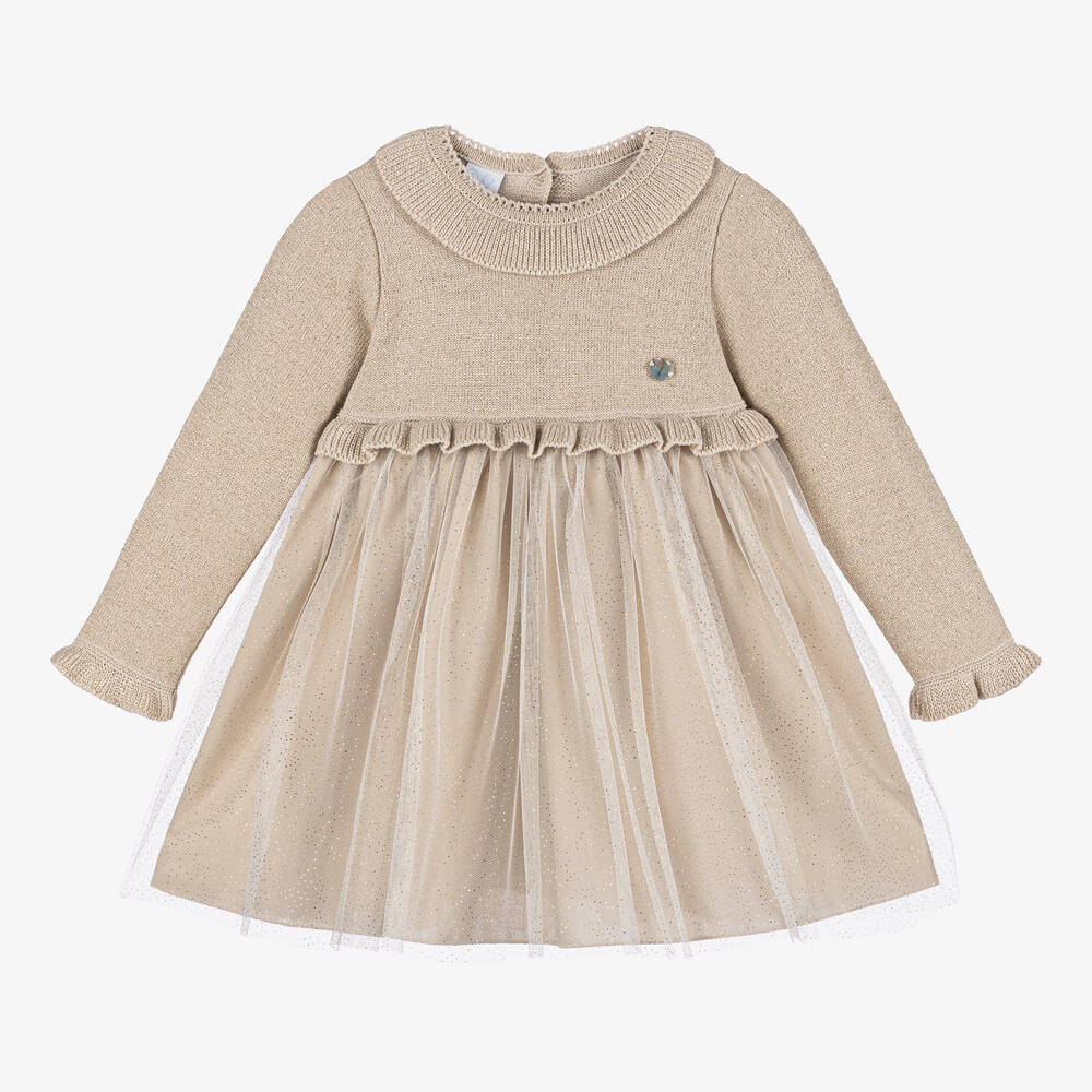 Gorgeous for a special occasion, this beige and shimmery gold dress for girls by Artesanía Granlei is an exclusive to Childrensalon. The beautifully knitted lurex bodice has pretty ruffle trims and a pearlescent logo charm on one side. The soft white tulle skirt overlay sparkles with gold speckles and has a beige underlayer and a lightweight lining for added comfort and volume. Mother-of-pearl buttons fasten the dress neatly on the back.
