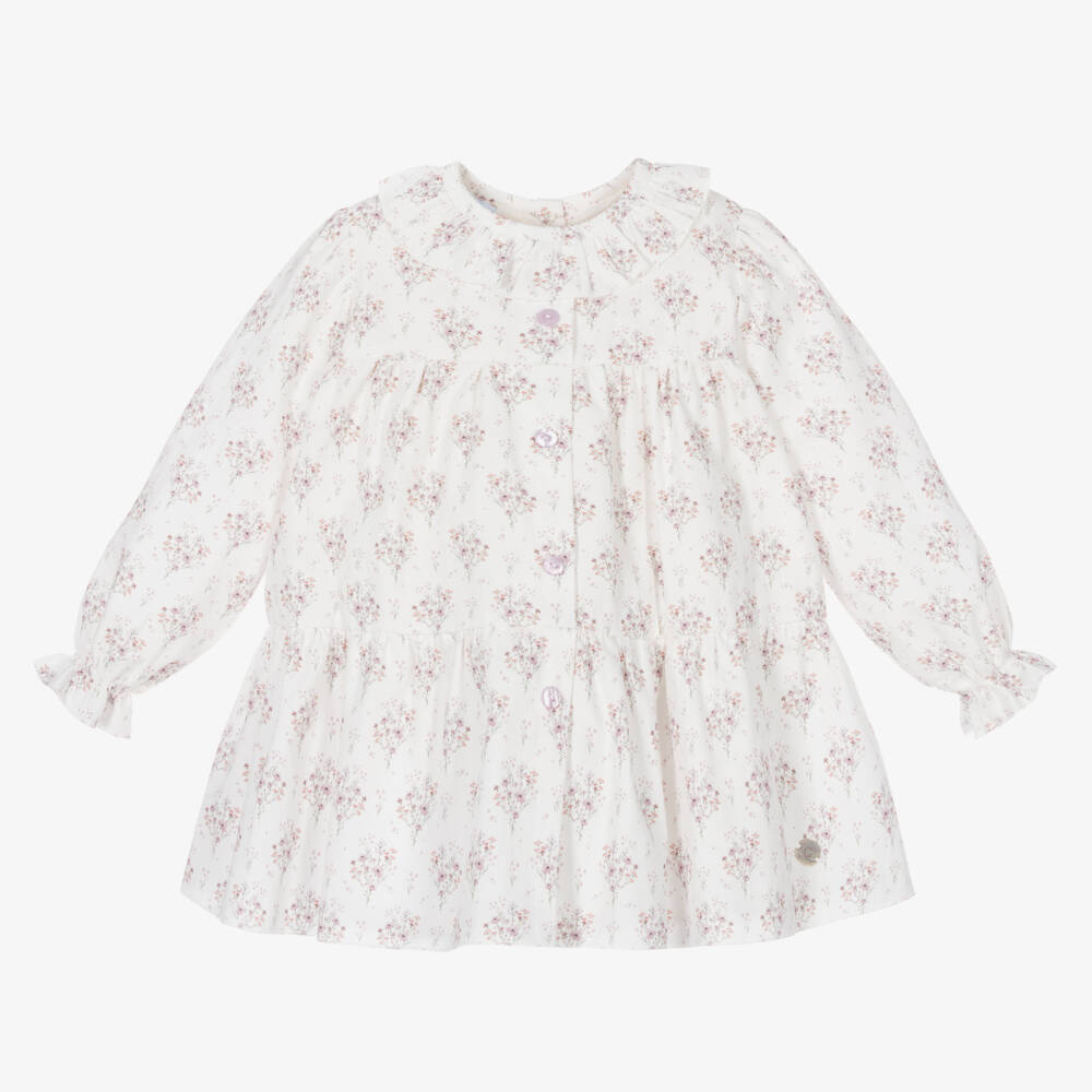Beautiful white cotton poplin dress for girls by Spanish brand, Artesanía Granlei. Patterned with gorgeous purple floral bouquets, this tiered dress has a ruffled collar, romantic puffed sleeves, and a decorative front placket trimmed with pearlescent lilac buttons, for a classic look. Fully lined for comfort, there are useful button fastenings on the back and the brand's signature mother-of-pearl logo charm on the front.