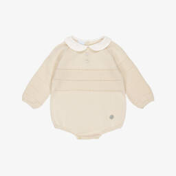 Charming green shortie for baby boys and girls by Artesanía Granlei, softly knitted for a comfortable feel. It has a lovely openwork design and a sweet white Peter Pan collar with decorative buttons on the front. There are button fastenings on the back and between the legs for a traditional finish.