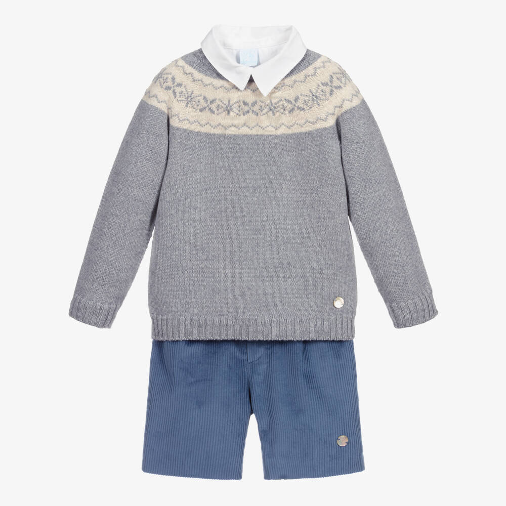 Boys grey and blue outfit set by Artesania Granlei. The grey wool-blend jumper is softly knitted with an ivory patterned yoke and a mother-of-pearl logo tab on the front. The blue shorts are made in soft cotton corduroy with a lightweight lining. They have an adjustable waistband for a comfortable fit. A white, lightweight cotton shirt completes the set.