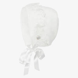 Lovely blue-grey bonnet for baby boys and girls by Spanish brand Artesanía Granlei, made in a beautifully soft knit. It has a signature logo charm sewn on the side and a delicate sunflower design on the back. It ties underneath the chin for a secure fit.