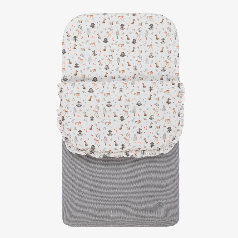 Charming grey knitted nest for baby boys and girls from Spanish brand Artesanía Granlei. Lined with cotton poplin patterned with an adorable woodland animal print visible on the pillow and turned over front, this lightly padded nest is ideal for keeping your little one cosy and warm. The zip fastening allows the nest to be laid flat for laying or playing on.