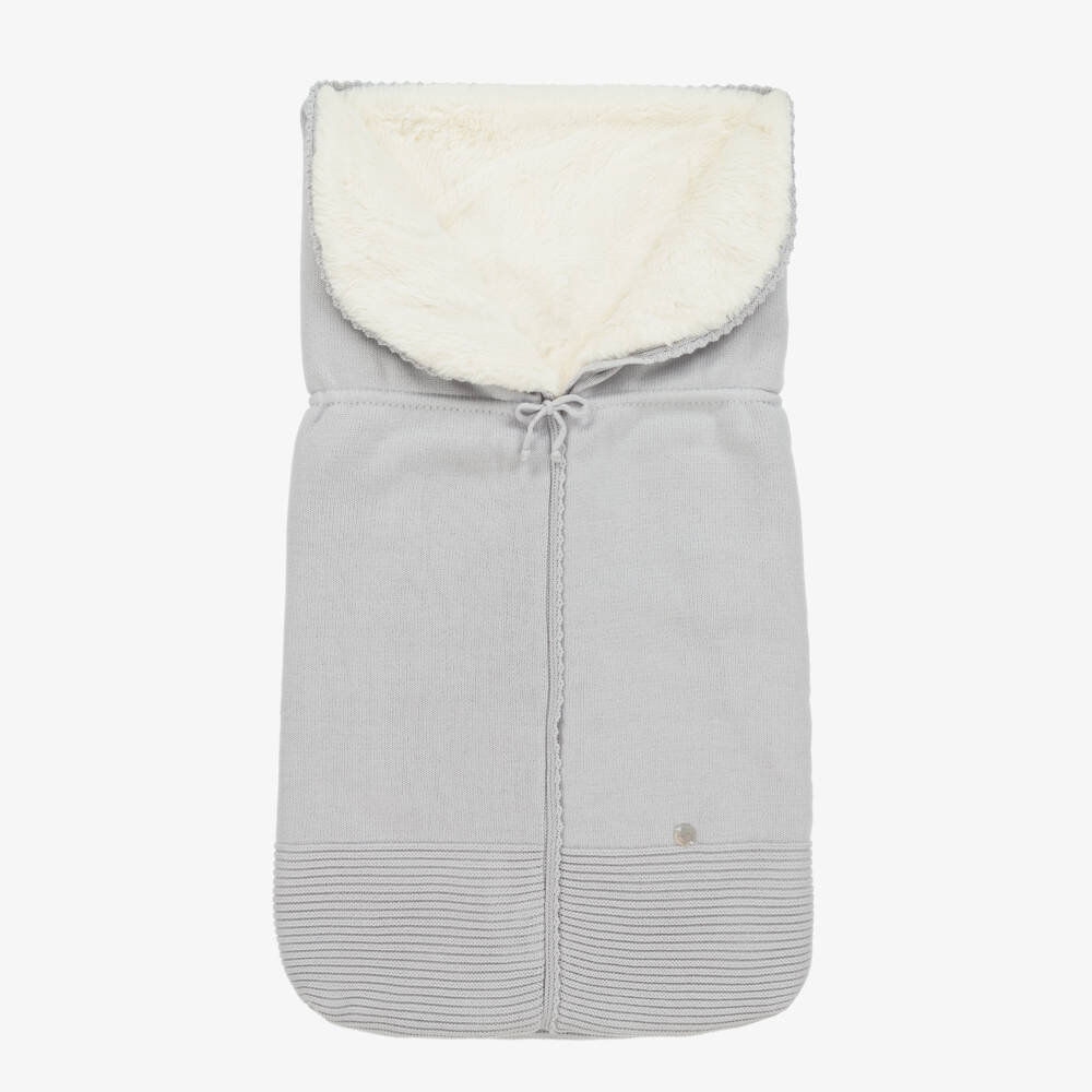 A cosy grey-blue nest for baby boys and girls by Spanish brand Artesanía Granlei. In a beautifully soft knit, this warmly padded accessory is fully lined in super soft faux fur with a drawstring fastening for a snug and secure feel. It fastens with a full-length zip and is finished with a mother-of-pearl logo charm on the front.