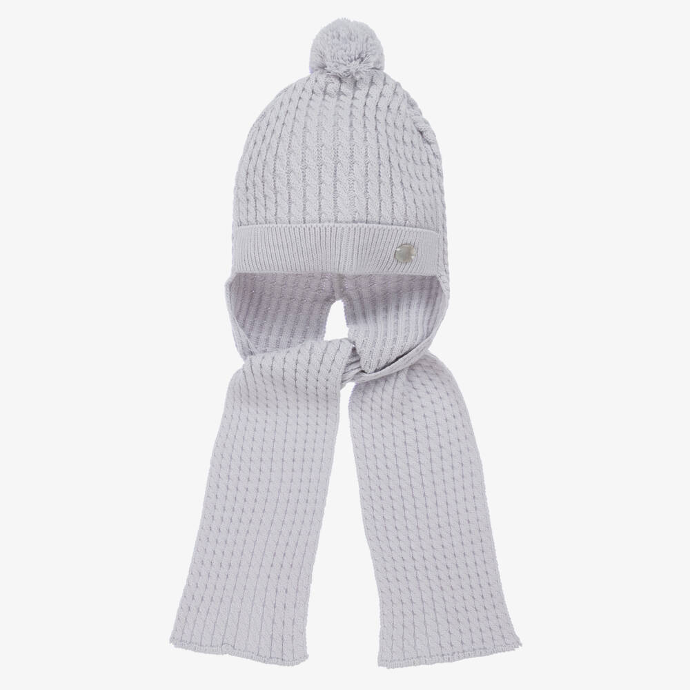 Lovely light blue-grey knitted hat for little boys and girls by Artesanía Granlei. The cable knit is timelessly stylish and a pom-pom on top of the hat gives a sweet finish. There is an attached scarf which ties under the chin for added comfort and warmth and the brand's signature mother-of-pearl logo charm is on the ribbed brim.