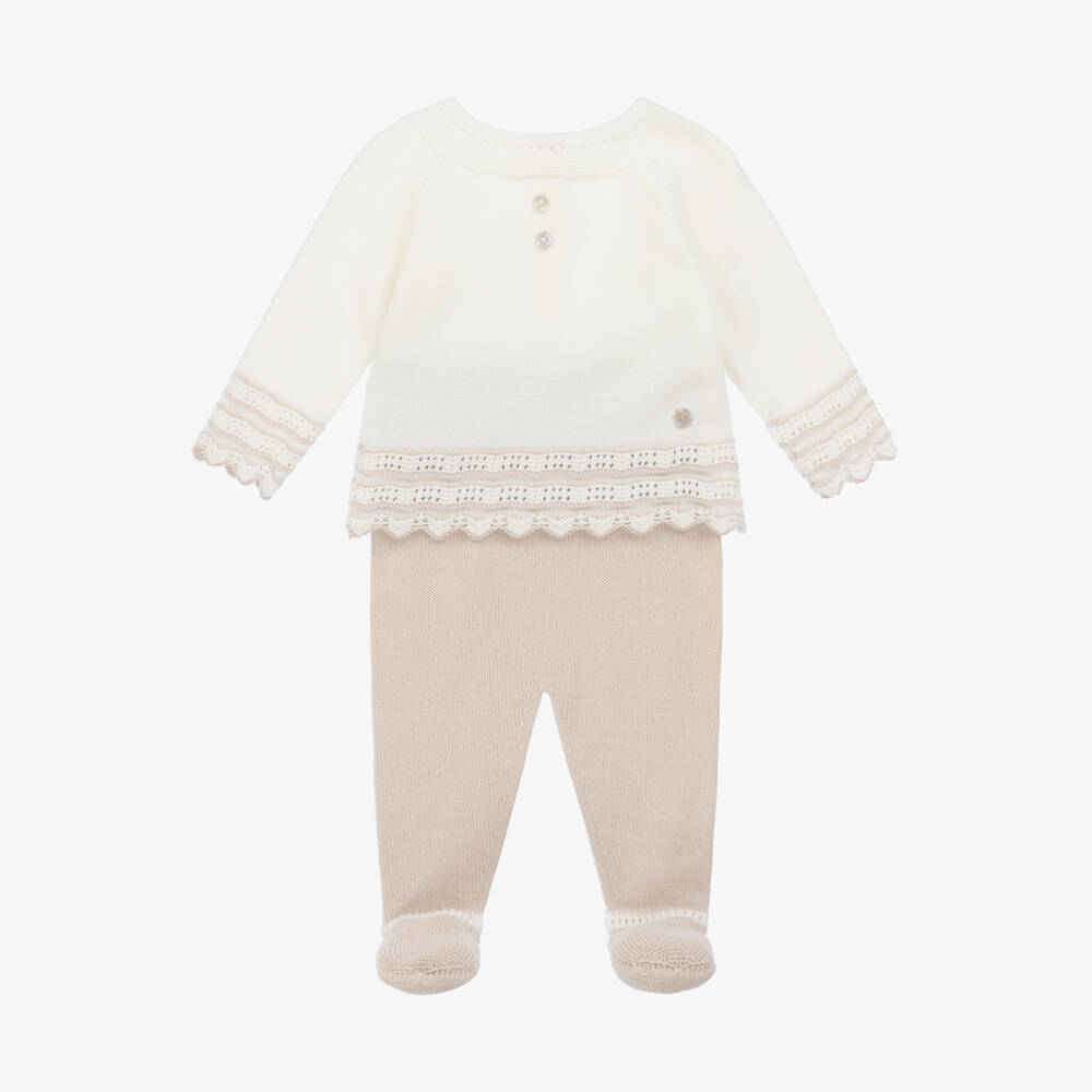 Finely knitted ivory and beige two piece babygrow for boys and girls by Spanish brand Artesanía Granlei. Fastening with buttons on the back, the long-sleeved top has beautiful lace knit details and decorative mother-of-pearl buttons. The matching bottoms have a stretchy, ribbed waistband and enclosed feet.