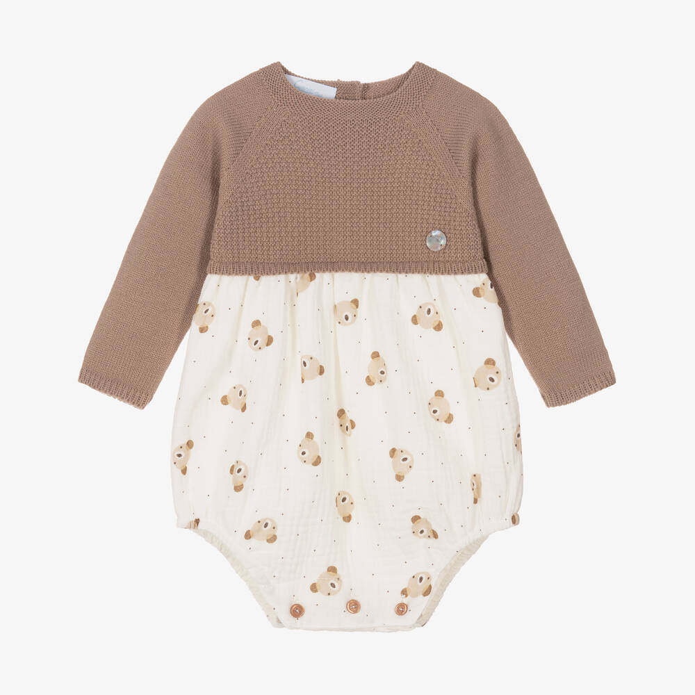 Ivory and brown shortie for baby boys and girls by Spanish brand Artesanía Granlei. The bodice and sleeves of this traditional style are softly knitted, whilst the main body is made in beautifully soft cotton muslin, patterned with cute teddy bears. It fastens with buttons on the back and between the legs and is trimmed on the front with the brand's mother-of-pearl logo charm.