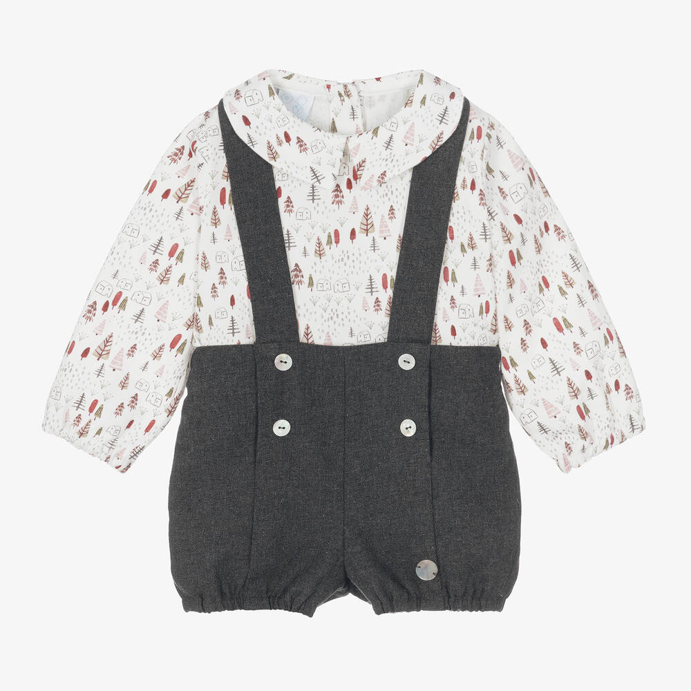 Sweet and charming, this ivory and charcoal grey cotton shorts set for boys and girls is by Artesanía Granlei. Made from soft twill, the long-sleeved blouse is printed with a lovely forest pattern featuring little trees and houses in muted green and red shades. Fastening with buttons on the back, it has a pointed collar for a sweet finish. The smooth woven shorts have a lightweight lining and a partially elasticated waist for added comfort. Decorated with faux mother-of-pearl buttons, they have attached button-fastened braces that crossover on the back. Both pieces are stitched with a logo charm on the front for an extra branded touch.