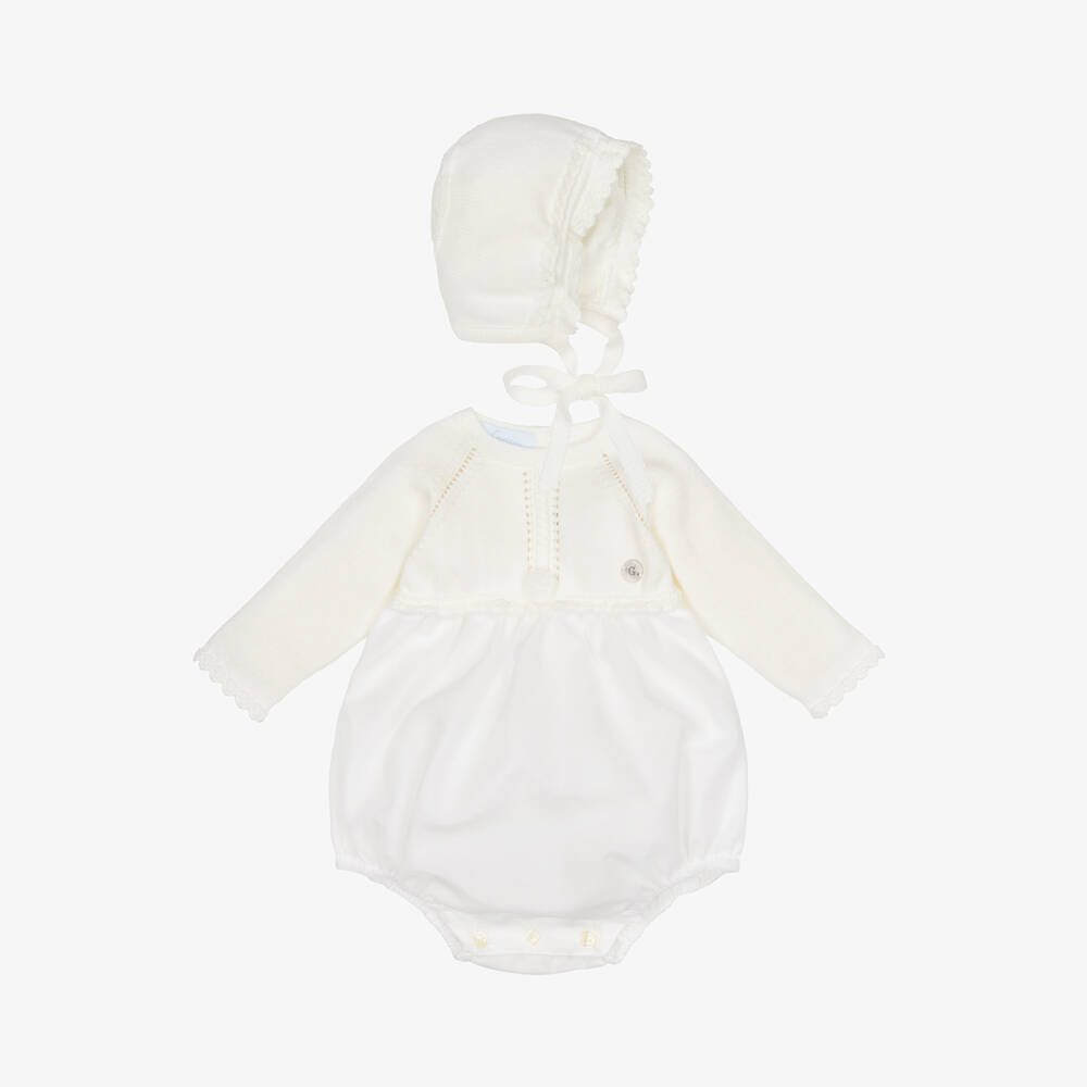 An ivory and white shortie set for baby boys and girls by Spanish brand Artesanía Granlei. Softly knitted, the long-sleeved bodice is detailed with lace knit patterns and scalloped trims. It buttons neatly on the back. The lower body is made in lightweight cotton-blend voile with a fine tulle overlay. Traditional in style, this babysuit fastens with buttons between the legs and is branded with a mother-of-pearl logo charm on the front. It comes with a matching bonnet that ties comfortably under the chin.