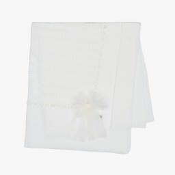 Ideal for keeping cosy, this soft pink blanket for baby boys and girls is by Artesanía Granlei. Gentle on delicate skin, it is knitted in a cotton and acrylic blend. Featuring a crochet lace pattern, it has a ivory tulle bow and a mother-of-pearl logo charm.