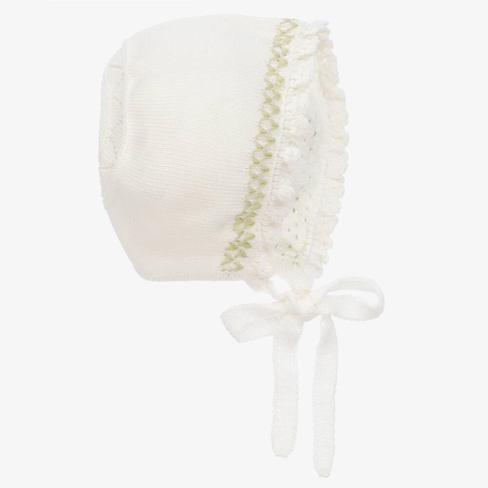 Ivory knitted bonnet for baby boys and girls from Spanish brand Artesanía Granlei. Made in a comfortable cotton blend, it has a sweet green embroidered trim around the brim and a lovely patterned crown. The label's logo charm is stitched on one side and the bonnet fastens with knitted ties under the chin.