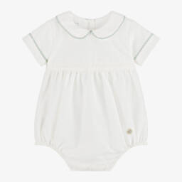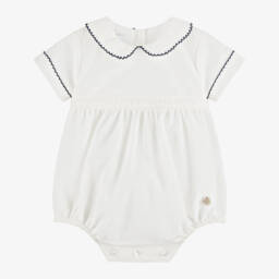A charming ivory tulle shortie for baby boys and girls by Artesanía Granlei, exclusive to Childrensalon. Lovely for a special occasion, this traditional, bubble-shaped babysuit is trimmed with delicate lace and navy blue picot embroidery. It is lined in soft cotton for a gentle feel against the skin and fastens on the back and between the legs with buttons.