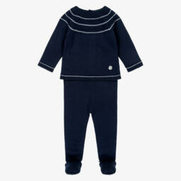 Navy blue two piece babygrow for boys and girls by Artesanía Granlei, finely knitted for a soft, cosy feel. The top has a contrasting white stitched trim and back button fastenings, while the trousers have a gently elasticated waistband and enclosed feet, trimmed with bows. Both pieces feature the brand's signature mother-of-pearl logo charms.