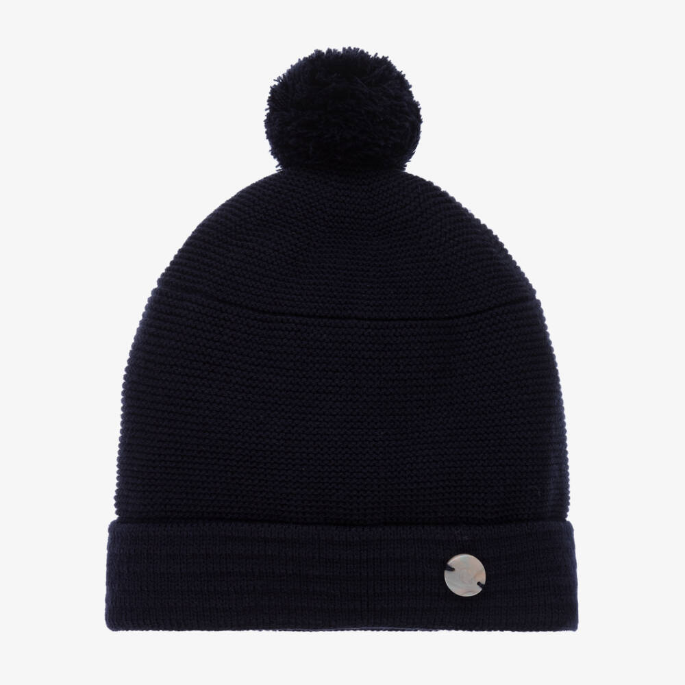Lovely navy blue hat for boys and girls by Artesanía Granlei, crafted in a soft knit. Cosy and comfortable to wear, it has a sweet pom-pom on the top and a turn-up brim with a signature logo charm, for a stylish designer finish.