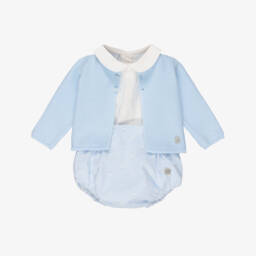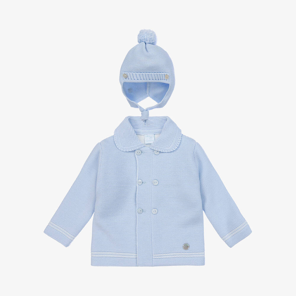 Traditional pale blue knitted pram coat and bonnet set for boys and girls by Spanish brand Artesania Granlei. The coat has double-breasted button fastenings on the front, white knit trims and a knitted white lining for extra cosiness. The cute pom-pom bonnet has a ribbed trim with decorative buttons on the front and knitted ties to fasten. Both pieces have a mother-of-pearl logo charm.