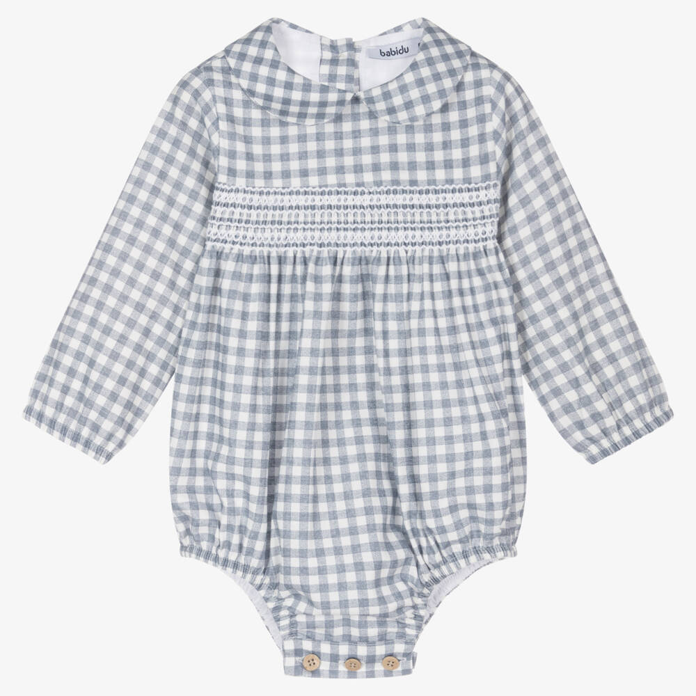 Adorable blue-grey check shortie for baby boys by Spanish brand Babidu, made in soft and lightweight cotton. It has traditional smocked detailing across the chest, with a smart rounded collar and long sleeves with gently elasticated cuffs. Fully lined for comfort, it fastens with buttons on the back and between the legs.