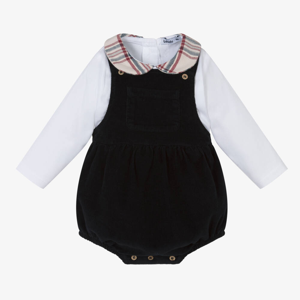 A white and dark blue cotton shortie set for baby boys by Babidu. Worn alone or as an outfit, the needlecord babysuit has cross-over button-on straps and a stretchy elasticated back. A white shirt completes the look, with a check Peter Pan collar and front pleat detail. Buttons fasten on the back of the top and between the legs on the shortie.