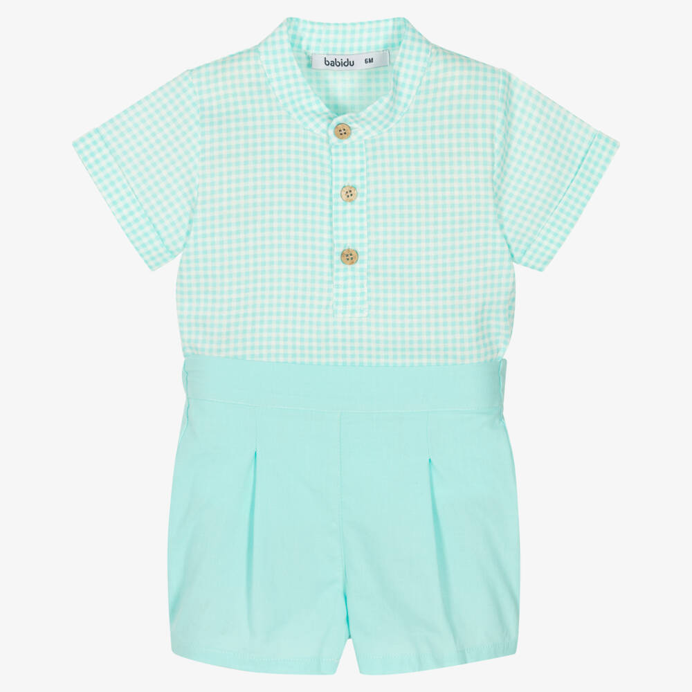 In a lovely shade of aqua blue, this cotton shirt and shorts set for little boys is by Babidu. The gingham shirt is in a collarless style and has traditional wooden buttons for fastening. Gently pleated on the front, the pull-on shorts are partly elasticated around the waist and legs for a comfortable fit.